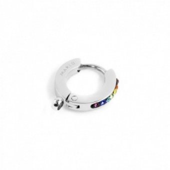 Mono orecchino in acciaio con cristalli multicolore, cerchio con diametro 11 mm, chiusura a pressione. Nella parte inferiore dell'orecchino è presente un anello per inserire un charm. Logo Marlù laserato sul lato
