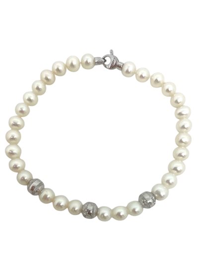 Bracciale di perle di diametro 5,5/6 con chiusura e palline in oro bianco 18 Kt.