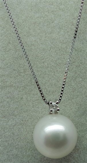 Collana in oro bianco 750/1000 con perla coltivata diametro 8/8,5.Incassato un diamante di carati 0.02