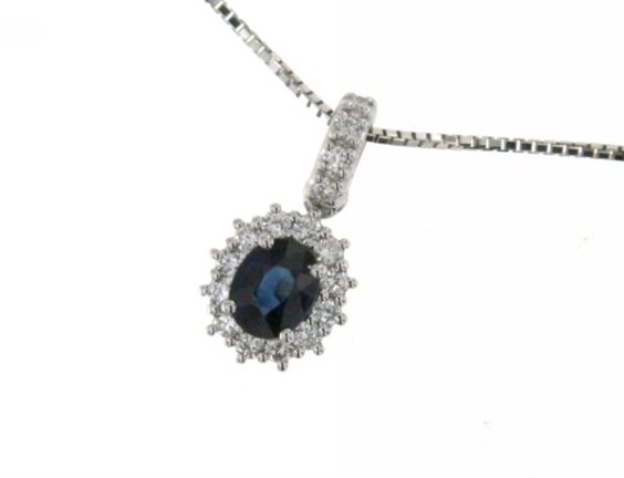collana in oro bianco con catena veneziana .Pendente ovale contorno di diamanti e zaffiro centrale grandezza cm 1 x 8mm. certificato di garanzia e gemmologico.