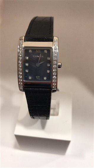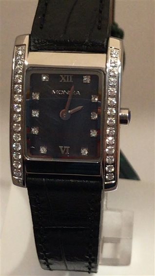 OROLOGIO MONDIA DONNA CASSA IN ACCIAIO CON ZIRCONI BIANCHI FONDO MADREPERLA GRIGIO/NERO SOLO TEMPO CINTURINO PELLE CHIUSURA DEPLOYANTE IN ACCIAIO.
