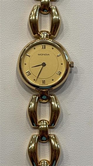 Orologio Mondia donna cassa e cinturino bracciale in oro giallo kt 18 con chiusura gioiello, quadrante tondo fondo oro giallo solo tempo. Movimento svizzero al quarzo.