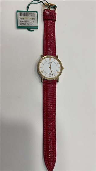 OROLOGIO MONDIA UNISEX CASSA IN ACCIAIO PLACCATO ORO GIALLO QUAQDRANTE FONDO BIANCO SOLO TEMPO CON DATARIO POSIZIONATO AL NUMERO 6, CINTURINO PELLE DI LUCERTOLA BORDEAUX CON CHIUSURA ARDIGLIONE IN ACCIAIO PLACCATO ORO GIALLO.