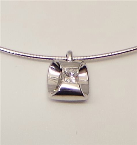 Collier di filo attorcigliato rigido-leggermente morbido. Il centro è a specchio con due pareti ad "ali" che alzano la pietra quadra. Il tutto in platino e diamante a taglio princess ct. 0.26 G, con Certificato .