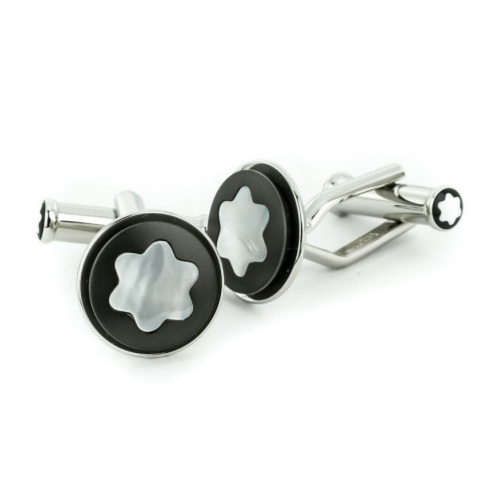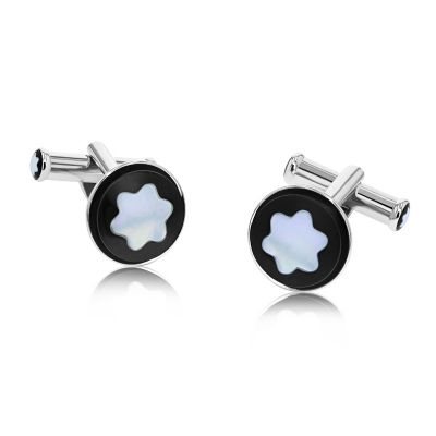 I gemelli stellati celebrano l’iconico emblema del manto nevoso. La struttura rotonda è di 16 mm di diametro è formato in acciaio inossidabile con una resina preziosa nera e una madreperla, con l’emblema del marchio stella Montblanc.