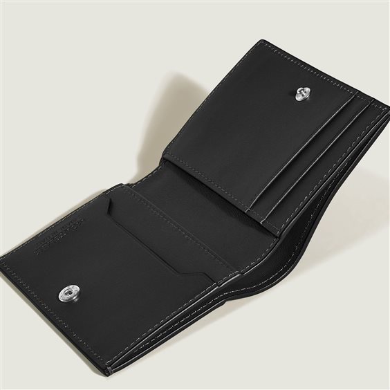Compatto ed elegante, questo portafoglio leggero è il compagno ideale per il lavoro e le serate. Il modello classico bi-fold presenta quattro aperture per carte di credito, uno scomparto per banconote e quattro tasche aggiuntive per spazio extra. Realizzato in morbida pelle di vitello nera, è completato dall’iconico emblema Montblanc sulla parte anteriore.