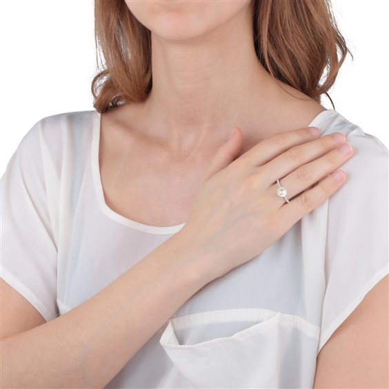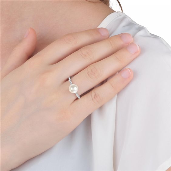 Anello in argento 925 rodiato, perla bianca coltivata (mm 7) e zirconi bianchi incassati sul gambo. Misura 16.