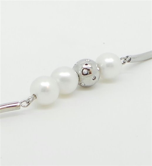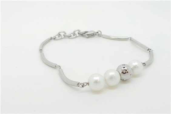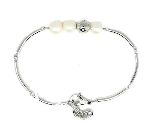 Bracciale ad elementi in acciaio lucido con perle naturali bianche e una perla in acciaio lucido con inserto di cristalli bianchi. Chiusura con moschettone in acciaio lucido. Lunghezza regolabile da cm 17 a cm 19. Immagine indicativa , la confezione può variare in forma e colore.