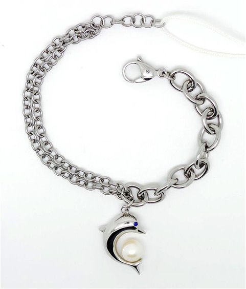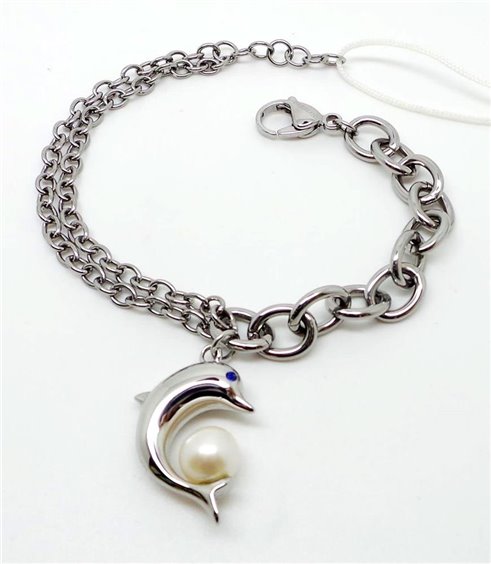Bellissimo bracciale dal design assimmetrico. Il tutto rifinito da un ciondolo a forma di delfino con una perla.
