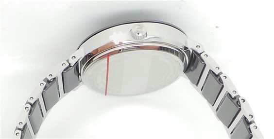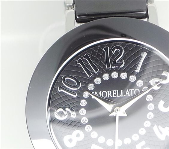 orologio in acciaio e ceramica diametro 30mm. quadrante con strass e numeri leggibili, bracciale ceramica e acciaio con chiusura deployante a pulsanti, movimento quartz