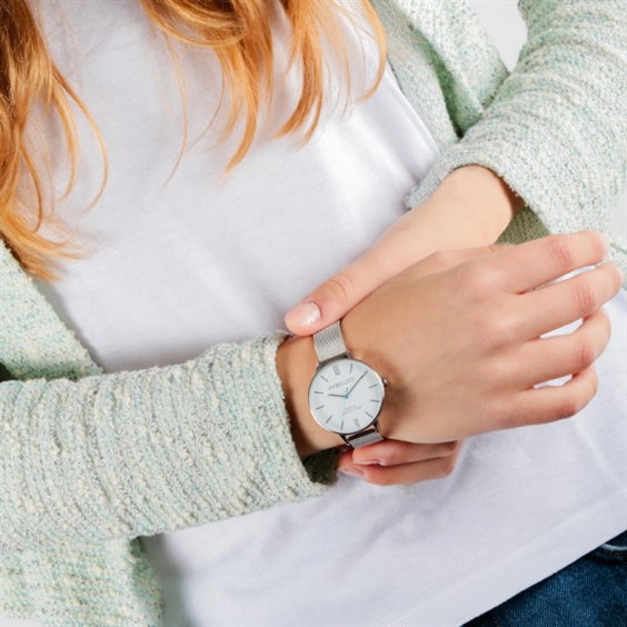 Orologio donna in acciaio 316L , movimento al quarzo , cassa mm 36 , quadrante bianco , indici e lancette acciaio , vetro minerale , fondello a pressione , cinturino in acciaio maglia milano , chiusura con clip a uncino. Immagine indicativa , la confezione può variare di forma e colore. Bello e prezioso come un gioiello, questo orologio della collezione Ninfa. In questa linea ispirata alla stagione primaverile e che incarna la femminilità e il glamour, questo modello esprime una raffinatezza e una delicatezza davvero uniche. Grande protagonista è il bracciale in maglia milanese, nella versatile nuance dell’argento. Prezioso, ma allo stesso tempo facile da portare, è l’elemento che riassume perfettamente lo stile della donna moderna, romantica e grintosa. Si intona perfettamente ai bagliori dell’argento il bianco candido del quadrante, su cui spiccano tre lancette e gli indici. Questi ultimi sono nella stessa preziosa tonalità del bracciale, a parte la lancetta dei secondi, in un vivace azzurro. Un tocco di colore che ci ricorda che siamo nella stagione più vitale, in cui il grigio lascia il posto alle tonalità più brillanti. Il richiamo alla primavera si può intravedere anche in un dettaglio “segreto”: una delicata grafica floreale disegnata sul fondello. Un simbolo che rappresenta perfettamente lo spirito di questo speciale momento dell’anno, in cui il sole illumina e fa rinascere tutte le cose più belle. Un periodo perfetto per vivere appieno il proprio tempo, con un orologio che scandisca con stile e precisione ogni istante. È la magia di Ninfa, orologi unici.