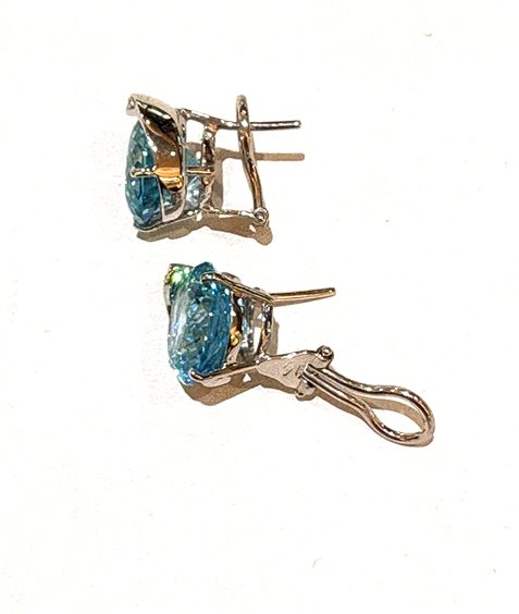 Orecchini in oro bianco 18Kr ispirati ai fluidi movimenti dell'acqua nei canali di Venezia, con grandi topazi azzurri idrotermali taglio fantasia brevettato NewPlanet e 4 piccoli diamanti taglio brillante ad impreziosire ulteriormente gli orecchini