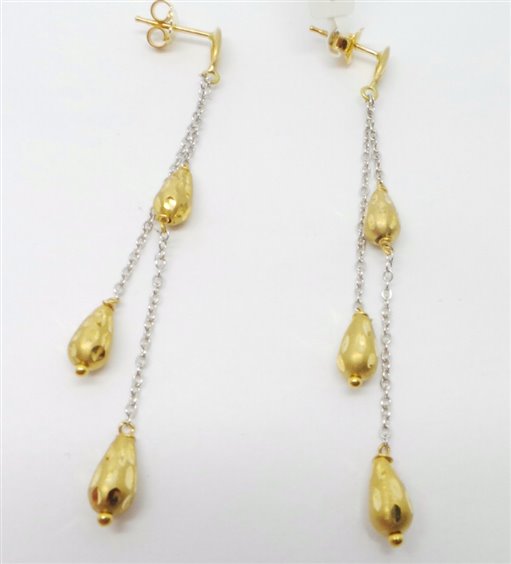 ORECCHINI IN ORO BIANCO E GIALLO CON DOPPIO FILO PENDENTE IN SCALARE, INPREZIOSITI DA GOCCIE ORO GIALLO ZIGRINATE SU SFONDO SATINATO , CON DIAMETRO DI MM4.5. CHIUSURA CON PERNO E FARFALLINA