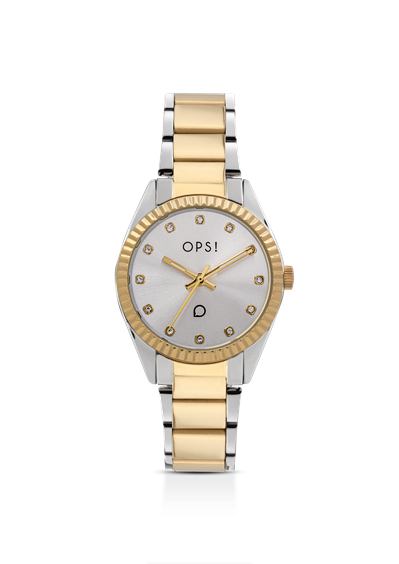Orologio da donna di Ops! della collezione Sport. La dimensione della cassa è di 31 mm di colore argento. Il cinturino è di colore argento e oro. Il quadrante è di colore argento con pietre bianche.
