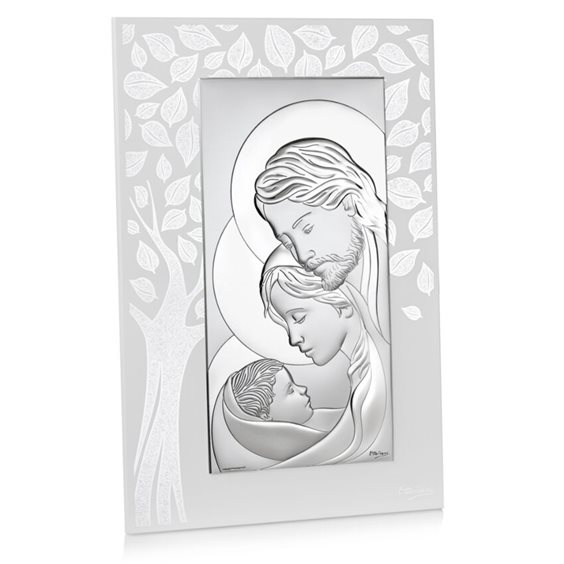Icona della marca Ottaviani, lastra in Mirò Silver su base di legno bianco, può essere utilizzata sia con base da appoggio che come quadro da appendere. Raffigurata sopra la lastra troviamo la Sacra Famiglia con l'albero della vita sullo sfondo dipinto su legno bianco. Dimensione 30,8×46,3.