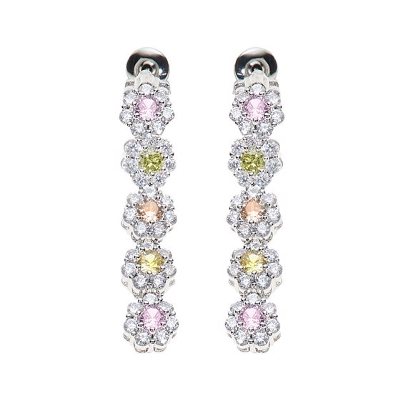 Orecchini in metallo ideati e realizzati da Ottaviani impreziositi da cubic zirconia multicolore, lunghezza 3,5 centimetri, larghezza 0,6 centimetri, peso 5 grammi, chiusura a farfallina.