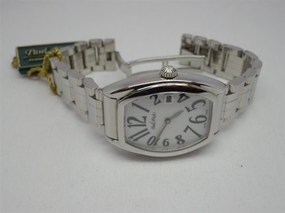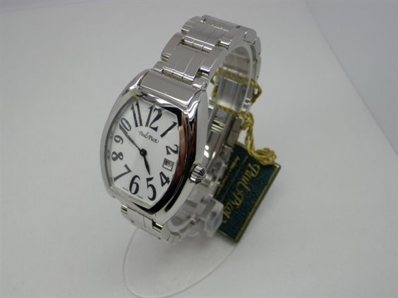 Orologio in acciaio, movimento automatico. Quadrante bianco con numeri arabi serigrafati. Funzioni ore, minuti, secondi e piccolo datario ad ore 6. Vetro zaffiro, fondello serrato con 4 viti, con incisione di tre abeti simbolo della contea di Firshire, impermeabile 30 mt. cassa a botte mm 39x32 anse e corona compresi