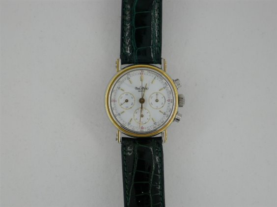 Orologio cronografo, monta movimento Lemania calibro 1874 meccanico a carica manuale. Movimento 17 rubini, 21.600 alternanze, interamente rifinito a mano con autonomia di 50 ore e bene in vista attraverso il fondello trasparente in vetro zaffiro. Cassa in acciaio e oro che ne definisce i contorni sia sulla lunetta che sulle doppie anse avvitate Lunetta con lavorazione a gradini, vetro zaffiro bombato, quadrante in smalto bianco con 3 contatori con scala sessantesimale e indicazione dei mezzi secondi sul perimetro e tachimetrica sul rehaut, indici a bastone applicati. Cinturino originale in coccodrillo verde con fibbia personalizzata, chiusura ad ardiglione.