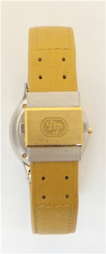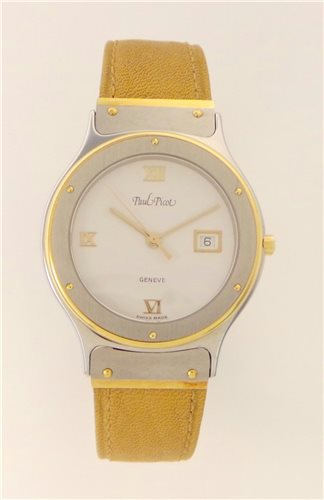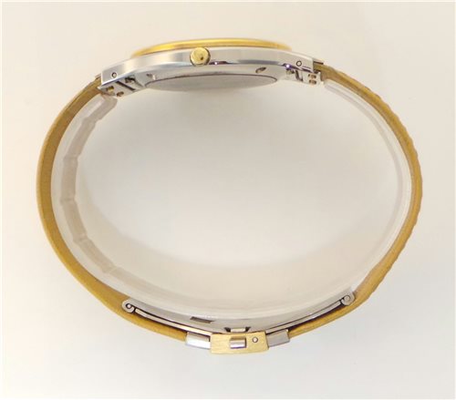 Orologio solo tempo. Cassa in acciaio-oro, lucida e spazzolata Ø 32 mm. h 6,2 mm. Movimento svizzero al quarzo, ore, minuti, secondi e data. Vetro zaffiro. Quadrante bianco smalto. Cinturino in pelle con chiusura personalizzata a due pulsanti. Impermeabile 5 Atm. Peso 40 grammi. Scatola e garanzia Originali.