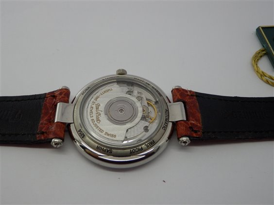 Orologio automatico funzioni ore, minuti, secondi e datario ad ore 3. Lancette per ore e minuti tipo "Breguet". Vetro zaffiro, con fondello a vista. Cinturino in coccodrillo con attacco tipo van cleef con chiusura ad ardiglione.