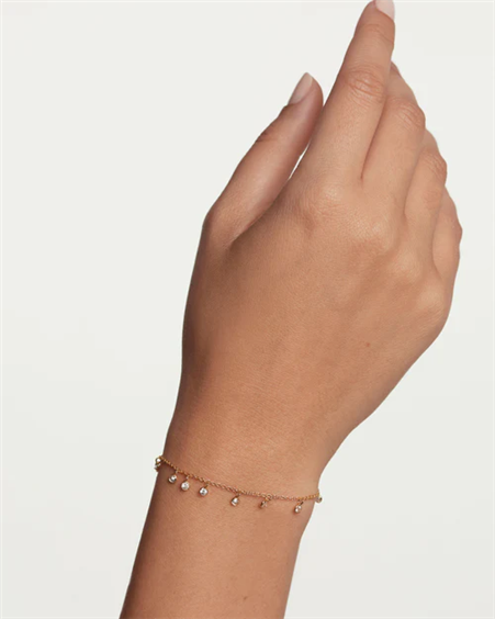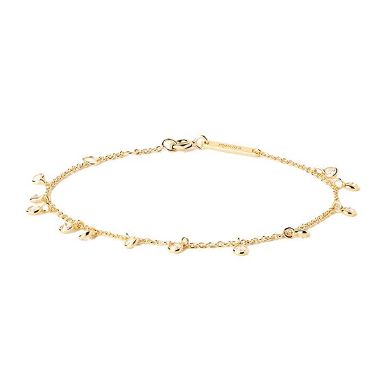 MATERIALE: Argento sterling FINITURA: Placcatura in oro 18k PIETRE: Zirconi bianchi DIMENSIONI DELLE PIETRE: 3 mm LUNGHEZZA DELLA CATENA: Chiusura regolabile da 14 cm a 18 cm PESO: 1,20 g