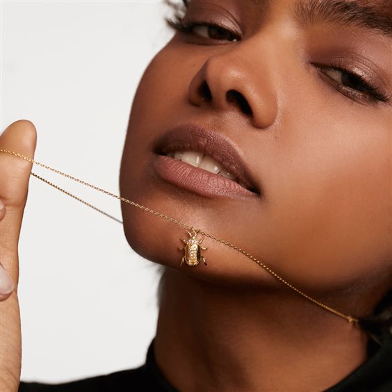 Collana in argento 925 con placcatura in oro 18kt. Pendente coleottero con pietre labradorite e zirconia.