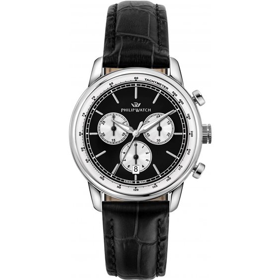 Orologio cronografo da uomo, collezione ANNIVERSARY, dotato di un movimento al quarzo Swiss made. Cassa in acciaio da 40mm, spessore 10.75mm, finitura lucida con fondello serrato a vite. Vetro minerale antigraffio, quadrante nero con contatori bianchi e particolari colore acciaio lucido e datario ad ore 6. Cinturino in pelle naturale con fibbia ardiglione. Water resistant 10atm. Garanzia ufficiale 2 anni Philip Watch.