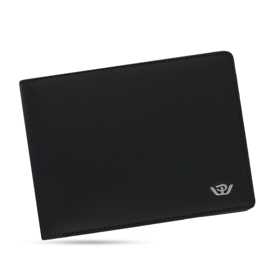 Portafoglio Philip Watch. In cuoio nero liscio, con logo in acciaio. Inserto estraibile. Misure cm 10 x 9.