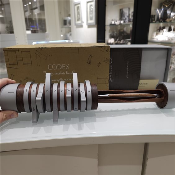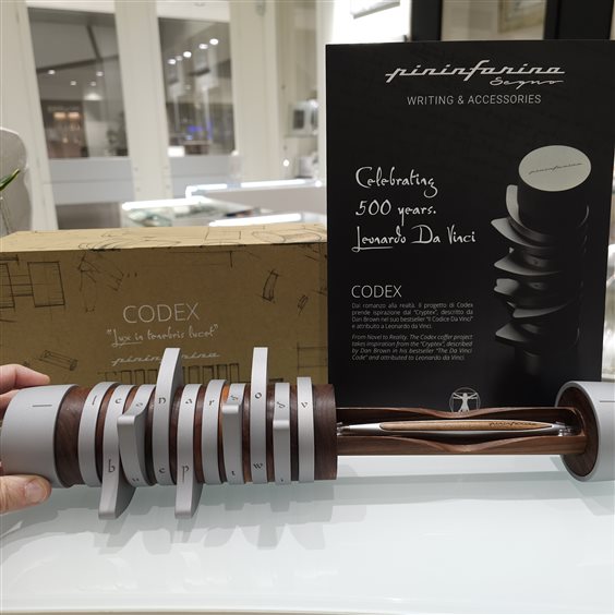 Il Codex è realizzato in alluminio e legno di noce; verrà prodotto per un periodo di tempo limitato - solo nel 2019 - in occasione del 500esimo anniversario dalla morte di di Leonardo da Vinci. Il Codex prende ispirazione dal Cryptex de "Il codice Da Vinci"di Dan Brown; un dispositivo - che lo scrittore attribuisce a Leonardo da Vinci - che custodisce all'interno informazioni accessibili solo a chi indovina la corretta sequenza di lettere tra quelle presenti sui dischi rotanti. Lo stesso meccanismo del Crystex è applicato al Codex: allineando le lettere che compongono il codice, le tacche interne si dispongono in modo tale da permettere l'apertura del cilindro. Suggestivo e affascinante, dedicato da Pininfarina Segno a tutti gli appassionati del Codice Da Vinci e a coloro a cui piace pensare che il Cryptex avrebbe veramente potuto essere frutto del genio di Leonardo; per rivivere ogni giorno il mistero evocato dal romanzo. All'interno c'è la matita originale con punta in ethergraph. SCATOLA E CERTIFICATO ORIGINALI