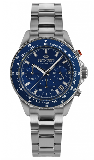 Cassa Acciaio diametro 37,50 mm, water resistant 10 ATM, corona serrata a pressione personalizzata, vetro minerale, fondello acciaio serrato a vite, lunetta in acciaio, ghiera girevole unidirezionale in acciaio, mm 11 Quadrante Nero o blu ghiera nera o ghiera blu, indici, datario fra il 4 e il 5 Bracciale Acciaio solido, ansa 18 mm, chiusura deployante personalizzata con fermaglio di sicurezza Movimento Chrono quartz, Miyota OS20