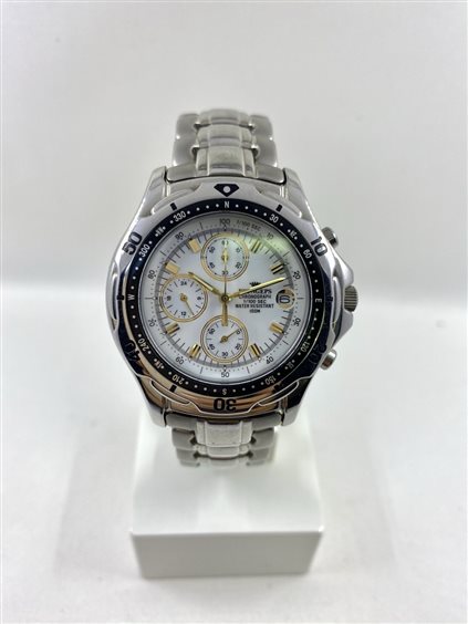 OROLOGIO PRYNGEPS UOMO CON CASSA E CINTURINO IN ACCIAIO. QUADRANTE BIANCO CON DETTAGLI COLOR ORO GIALLO. GHIERA NERA. CRONOGRAFO, ANALOGICO, IMPERMEABILITA' 100 M.