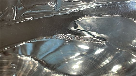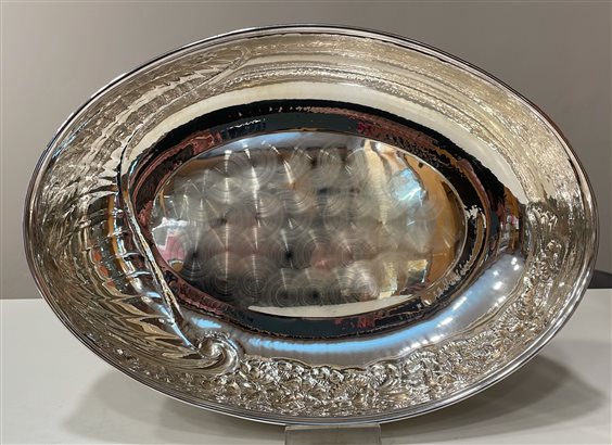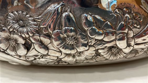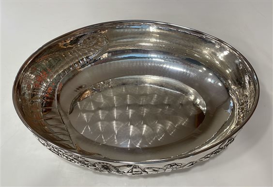 PREGIATO PEZZO D'ARGENTERIA DELL'ARTIGIANATO FIORENTINO. L'ALTA QUALITA' DEI MATERIALI E DELLA LAVORAZIONE SONO GARANTITI DAI MARCHI LEGALI IMPRESSI SUL PEZZO. CITOLA OVALE RENATO RADDI IN ARGENTO MASSICCIO 800, GR 848, CON MOTIVI FLOREALI E FOGLIACEI, SUPERFICIE MARTELLATA E BORDO LISCIO. CESELLATA A MANO.