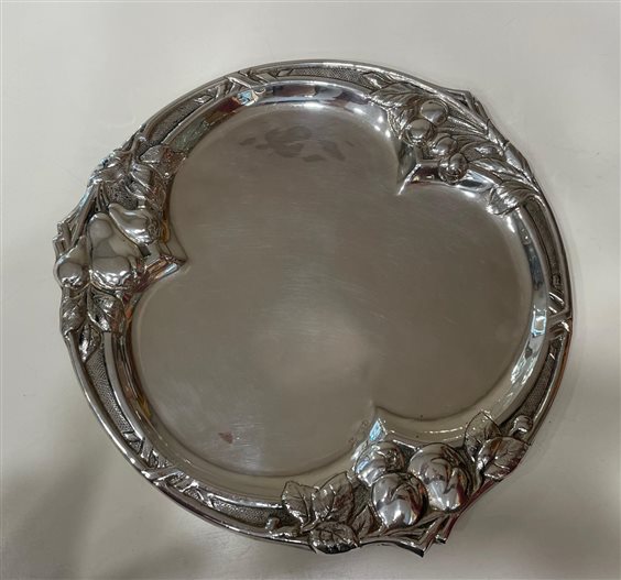 PREGIATO PEZZO D'ARGENTERIA DELL'ARTIGIANATO FIORENTINO. L'ALTA QUALITA' DEI MATERIALI E DELLA LAVORAZIONE SONO GARANTITI DAI MARCHI LEGALI IMPRESSI SUL PEZZO. VASSOIO RENATO RADDI IN ARGENTO MASSICCIO 800, GR 215, BORDI DECORATI A MANO CON MELOGRANI, PERE E CILIEGIE.
