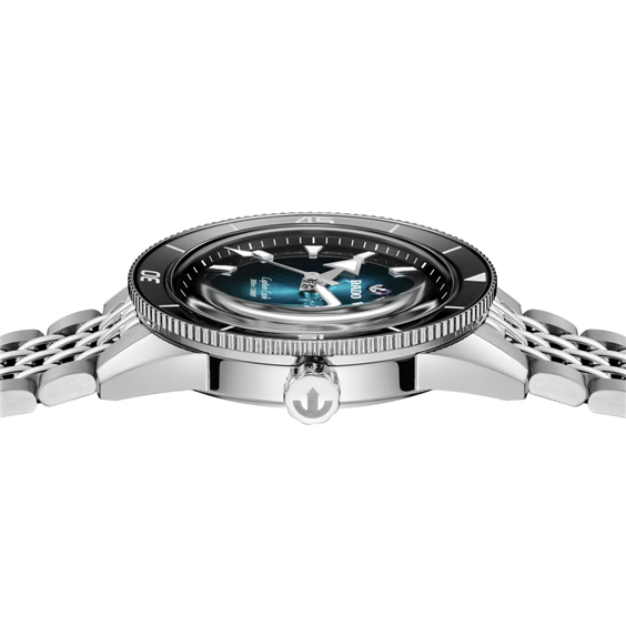 Captain Cook: l’orologio che coniuga eleganza e precisione, per chi pretende il massimo in ogni sfida quotidiana. La cassa da 39 mm in acciaio lucido si fonde armoniosamente con la lunetta girevole coordinata, impreziosita da un inserto in ceramica nera lucida con indici metallizzati argento. Il cristallo zaffiro sagomato, forgiato a temperature superiori a 2.000 °C e trattato con rivestimenti antiriflesso su entrambi i lati, garantisce una nitidezza impeccabile e una durezza seconda solo al diamante. Il movimento automatico R763 assicura affidabilità meccanica e precisione elevate, senza compromessi. Con 25 rubini e una regolazione in cinque posizioni, il movimento offre prestazioni stabili e affidabili in ogni condizione. Il movimento è dotato di spirale antimagnetica Nivachron™. Il movimento R763, cuore pulsante dell'orologio, con una riserva di carica di 80 ore, è progettato per resistere alle sfide quotidiane, garantendo affidabilità e precisione nel tempo. Il quadrante, con delicate sfumature dal nero al turchese, riflette una raffinatezza luminosa e discreta. Gli indici e le lancette color rodio sono rivestiti con Super-LumiNova® bianca, mentre il datario a ore 3 e l'iconica ancora girevole su una piastra posteriore in rubino esaltano la cura per i dettagli. Il bracciale “chicco di riso” in acciaio lucido e satinato, con fibbia a tripla piega, completa il design per offrire una vestibilità perfetta. Impermeabile fino a 30 bar (300 m), il Captain Cook è il partner perfetto per chi cerca l'avventura con stile senza rinunciare alla precisione svizzera