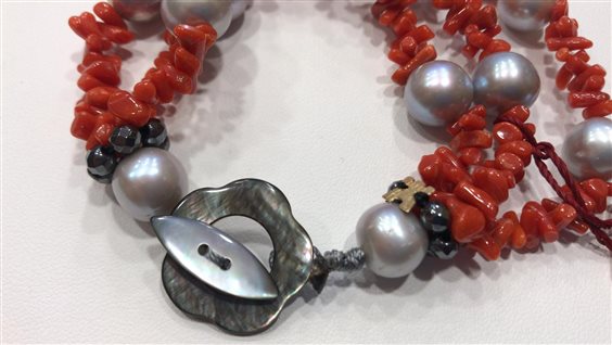 BRACCIALE RAJOLA LUCILLA 3 FILI DI CORALLO ROSSO CON PERLE GRIGIE E MATITE E GANCIO DI CHIUSURA MADREPERLA CON MARCHIO IN ORO GIALLO KT 18.