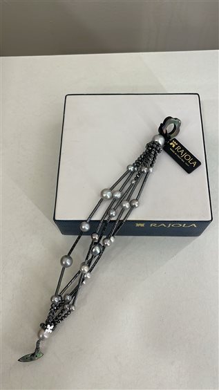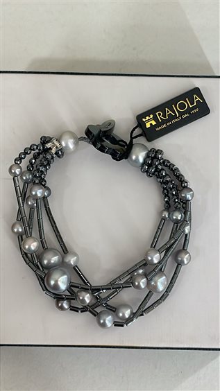 BRACCIALE RAJOLA COLLEZIONE COSMO IN 5 FILI DI EMATITE GRIGIA E PERLE GRIGIE COLTIVATE IN ACQUA DI FIUME, CHIUSURA GANCIO IN MADREPERLA GRIGIA E MARCHIO IN ORO BIANCO KT 18.