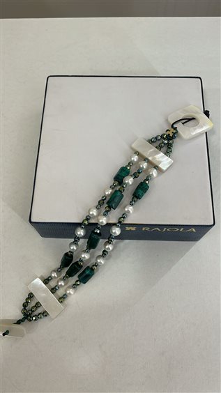 BRACCIALE RAJOLA COLLEZIONE DANCE IN 3 FILI DI MALACHITE, PERLE BIANCHE COLTIVATE IN ACQUA DI FIUME, CHIUSURA GANCIO IN MADREPERLA BIANCA,CON MARCHIO IN ORO GIALLO KT 18.