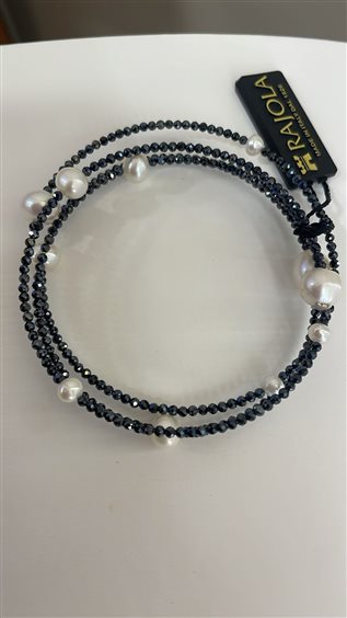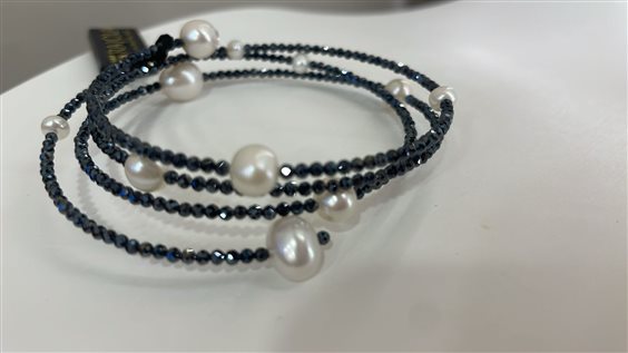 BRACCIALE RAJOLA COLLEZIONE SHINE, RIGIDO A 3 FILI IN SPINELLO BLU E PERLE BIANCHE COLTIVATE IN ACQUA DOLCE, MARCHIO IN ORO BIANCO KT 18.
