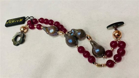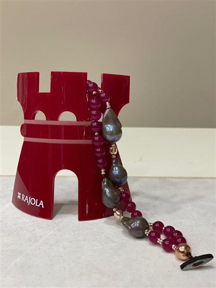 BRACCIALE VITA RAJOLA A 2 FILI CON GIADA BORDEAUX E PERLE SCARAMAZZE VIOLA EMATITE , GANCIO IN MADREPERLA GRIGIA CON MARCHIO IN ORO GIALLO KT 18.
