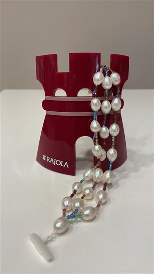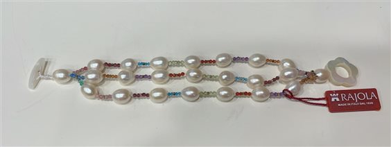 BRACCIALE RAJOLA CECILIA CON PERLE BIANCHE NATURALI, TORMALINA, GRANATO, EMATITE COLORATA AZZURRA, VERDE, ARANCIO, VIOLA, ROSA, VERDE TIFFANY .CHIUSURA GANCIO IN MADREPERLA BIANCA E MARCHIO IN ORO GIALLO 18 KT.