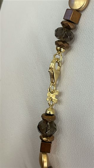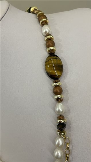 COLLANA RAJOLA COLLEZIONE CAPRICCI TENERIFE, CON QUARZO FUME', EMATITE, OCCHIO DI TIGRE, PERLE COLTIVATE IN ACQUA DOLCE E ARGENTO 925 PLACCATO ORO GIALLO, CON CHIUSURA A MOSCHETTONE.