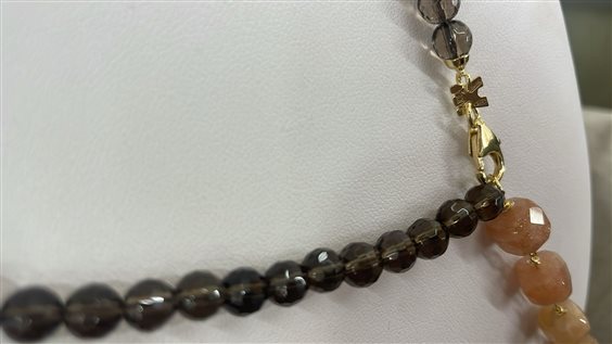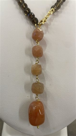 COLLANA RAJOLA COLLEZIONE CAPRICCI BRUGES, IN QUARZO FUME' E PENDENTE IN PIETRA DEL SOLE CON ARGENTO 925PLACCATO ORO GIALLO, CHIUSURA MOSCHETTONE, MISURA 45 CM.