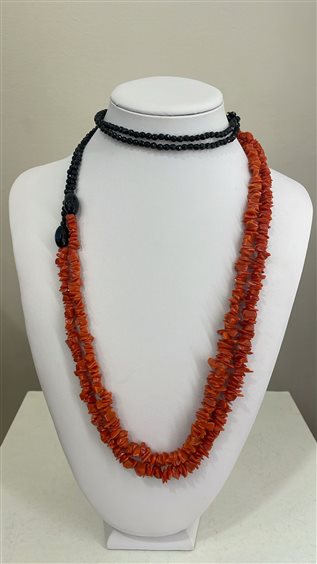 COLLANA RAJOLA COLLEZIONE ALEANDRA A 2 FILI DI CORALLO ROSSO E ONICE NERO, CON MARCHIO IN ORO GIALLO KT 18.