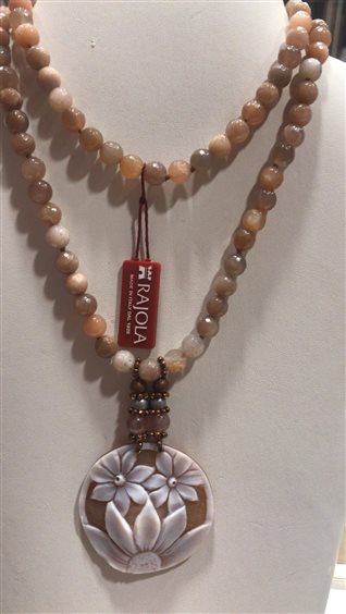 COLLANA RAJOLA MALIA IN PIETRA SOLE, QUARZO ROSA EMATITE BRONZO E CAMMEO CON MARCHIO IN ORO GIALLO KT 18.