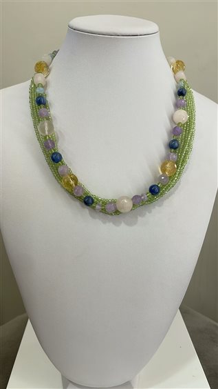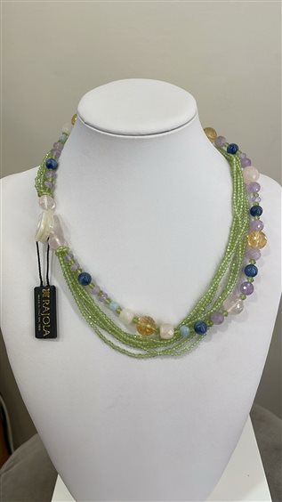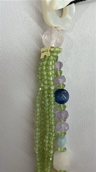 COLLANA RAJOLA COLLEZIONE MINUETTO, IN PERIDOTO, CITRINO ,QUARZO ROSA E CIANITE CON CHIUSURA IN MADREPERLA BIANCA E MARCHIO IN ORO GIALLO KT 18.