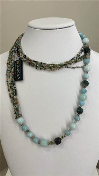 COLLANA MINUETTO RAJOLA IN 6 FILI DI EMATITE MULTICOLOR CON UN FILO DI AMAZZONITE AZZURRA E QUARZO FUME', CON MARCHIO IN ORO GIALLO KT 18.