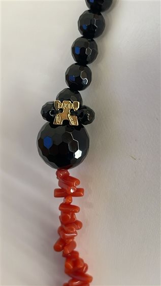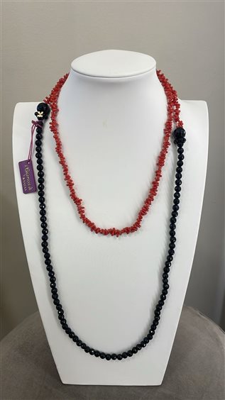COLLANA RAJOLA COLLEZIONE CAPRICCI PRIMULA, CON CORALLO ROSSO E ONICE NERO, MARCHIO IN ARGENTO 925 PLACCATO ORO GIALLO, MISURA 120 CM.