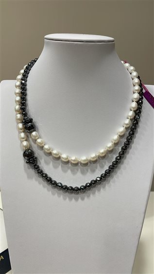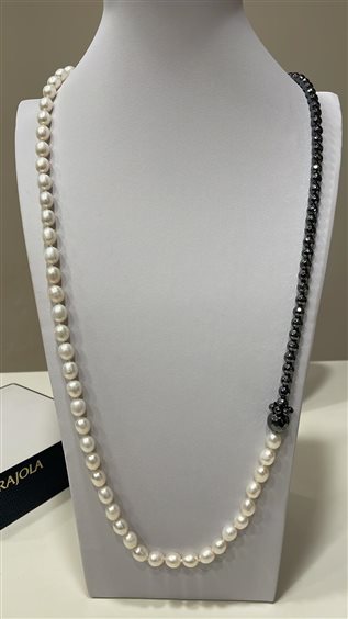 COLLANA RAJOLA PRIMULA CON EMATITE GRIGIA E PERLE BIANCHE CON MARCHIO RAJOLA IN ARGENTO.