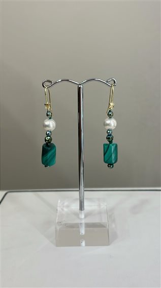 ORECCHINI RAJOLA COLLEZIONE DANCE PENDENTI IN ORO GIALLO KT 18 IN MALACHITE, EMATITE E PERLE COLTIVATE IN ACQUA DI FIUME.