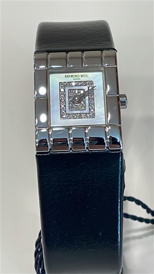 OROLOGIO RAYMOND WEIL DONNA QUADRANTE QUADRATO FONDO MADREPERLA SOLO TEMPO CON ZIRCONI BIANCHI.CASSA IN ACCIAIO CON CINTURINO PELLE NERA CHIUSURA IN ACCIAIO DEPLOYANTE.